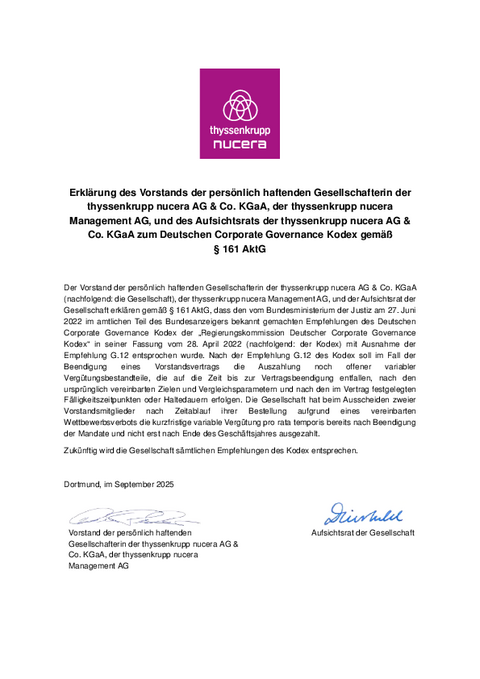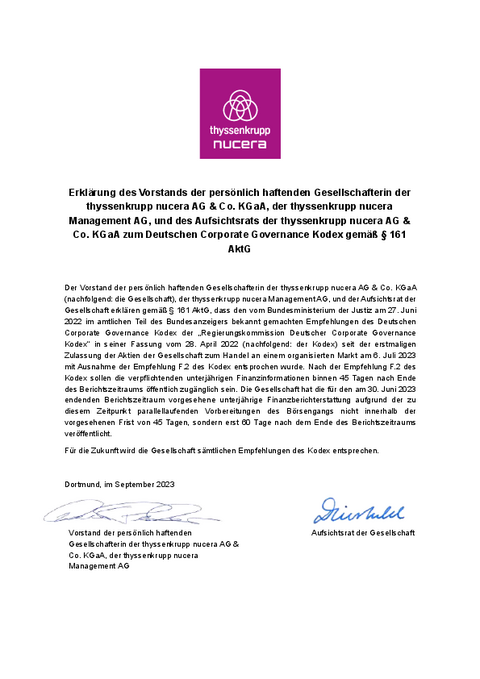 Im Nachfolgenden finden Sie die Übersicht zu allen Entsprechenserklärungen seitens thyssenkrupp nucera® AG & Co. KGaA.