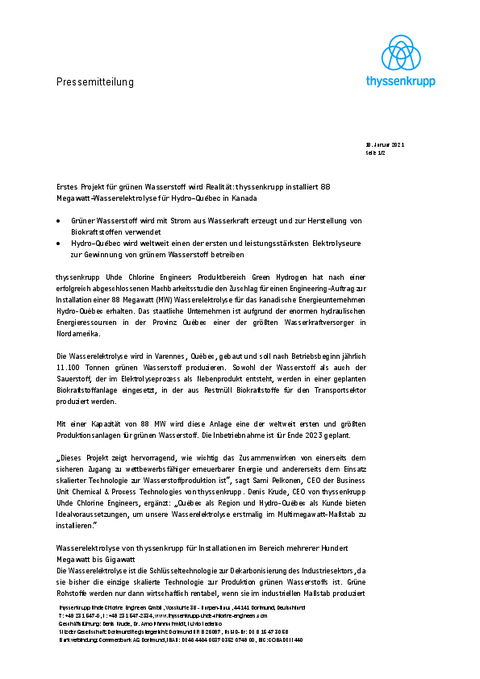 „Dieses Projekt zeigt hervorragend, wie wichtig das Zusammenwirken von einerseits dem sicheren Zugang zu wettbewerbsfähiger erneuerbarer Energie und andererseits dem Einsatz skalierter Technologie zur Wasserstoffproduktion ist“, sagt Sami Pelkonen, CEO der Business Unit Chemical & Process Technologies von thyssenkrupp. Denis Krude, CEO von thyssenkrupp Uhde Chlorine Engineers, ergänzt: „Québec als Region und Hydro-Québec als Kunde bieten Idealvoraussetzungen, um unsere Wasserelektrolyse erstmalig im Multimegawatt-Maßstab zu installieren.“
