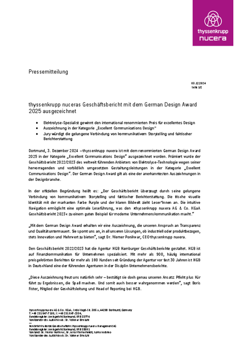 In der offiziellen Begründung heißt es: „Der Geschäftsbericht überzeugt durch seine gelungene Verbindung von kommunikativem Storytelling und faktischer Berichterstattung. Die frische visuelle Identität mit der markanten Farbe Purple und der klaren Bildwelt zieht Leser*innen an. Die intuitive Navigation ermöglicht eine optimale Leseführung, was den »thyssenkrupp nucera AG & Co. KGaA Geschäftsbericht 2023« zu einem guten Beispiel für moderne Unternehmenskommunikation macht.“
