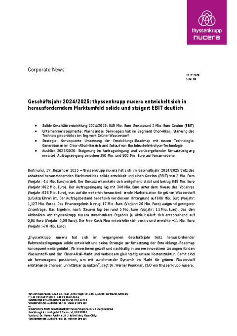Dortmund, 17. Dezember 2025 – thyssenkrupp nucera hat sich im Geschäftsjahr 2024/2025 trotz des anhaltend herausfordernden Marktumfeldes solide entwickelt und einen Gewinn (EBIT) von 2 Mio. Euro (Vorjahr: -14 Mio. Euro) erzielt. Der Umsatz entwickelte sich weitgehend stabil und betrug 845 Mio. Euro (Vorjahr: 862 Mio. Euro). Der Auftragseingang lag mit 348 Mio. Euro unter dem Niveau des Vorjahres (Vorjahr: 636 Mio. Euro), was auf die weiterhin herausford ernde Marktsituation für grünen Wasserstoff zurückzuführen ist. Der Auftragsbestand belief sich vor diesem Hintergrund auf 606 Mio. Euro (Vorjahr: 1,127 Mio. Euro). Das Finanzergebnis betrug 17 Mio. Euro (Vorjahr: 26 Mio. Euro) aufgrund geringerer Zinserträge. Das Ergebnis nach Steuern lag bei rund 5 Mio. Euro (Vorjahr: 11 Mio. Euro). Das den Aktionären von thyssenkrupp nucera zurechenbare Ergebnis je Aktie beläuft sich entsprechend auf 0,04 Euro (Vorjahr: 0,09 Euro). Der Free Cash Flow entwickelte sich positiv und erreichte +11 Mio. Euro (Vorjahr: -78 Mio. Euro).