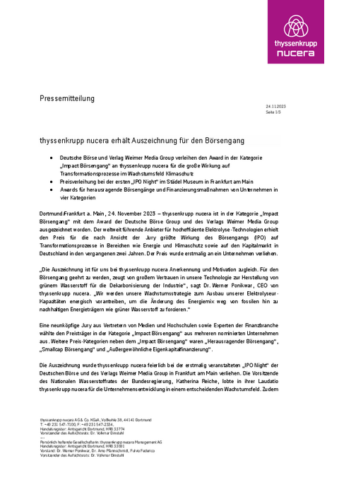 - Deutsche Börse und Verlag Weimer Media Group verleihen den Award in der Kategorie „Impact Börsengang“ an thyssenkrupp nucera für die große Wirkung auf Transformationsprozesse im Wachstumsfeld Klimaschutz
