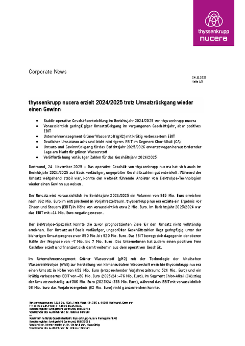 - Stabile operative Geschäftsentwicklung im Berichtsjahr 2024/2025 von thyssenkrupp nucera