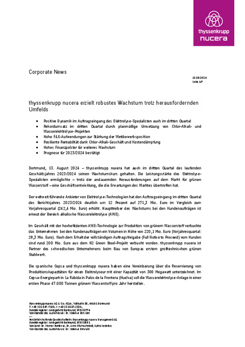 Dortmund, 13. August 2024 – thyssenkrupp nucera hat auch im dritten Quartal des laufenden Geschäftsjahres 2023/2024 seinen Wachstumskurs gehalten. Die Leistungsstärke des Elektrolyse-Spezialisten ermöglichte – trotz der andauernden Herausforderungen auf dem Markt für grünen Wasserstoff – eine Geschäftsentwicklung, die die Erwartungen des Marktes übertroffen hat.