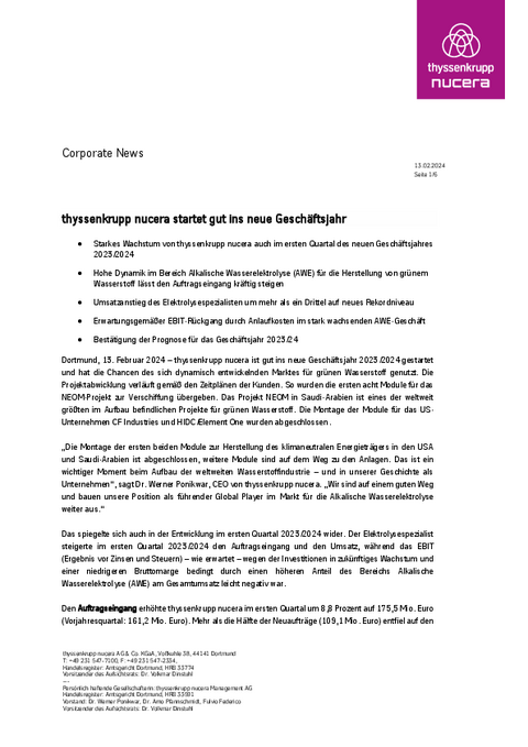 - Starkes Wachstum von thyssenkrupp nucera auch im ersten Quartal des neuen Geschäftsjahres 2023/2024