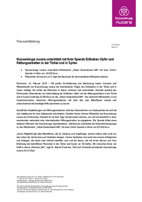 Gemäß den Empfehlungen von Hilfsorganisationen sieht das Unternehmen von Sachspenden ab und hat sich stattdessen für eine Geldspende entschieden. Darüber hinaus können Mitarbeiter bei thyssenkrupp nucera am Dortmunder Standort bis zu fünf Tage Sonderurlaub nehmen, um sich ehrenamtlich in einer anerkannten nationalen oder internationalen Hilfsorganisation zu engagieren. Die Spende bildet einen weiteren Hilfsstein der thyssenkrupp-Spendenaktion. Gemeinsam unterstützt die Unternehmensgruppe so das Hilfsbündnis „Aktion Deutschland hilft“ mit einer Sofort-Spende in Höhe von 55.000 Euro.