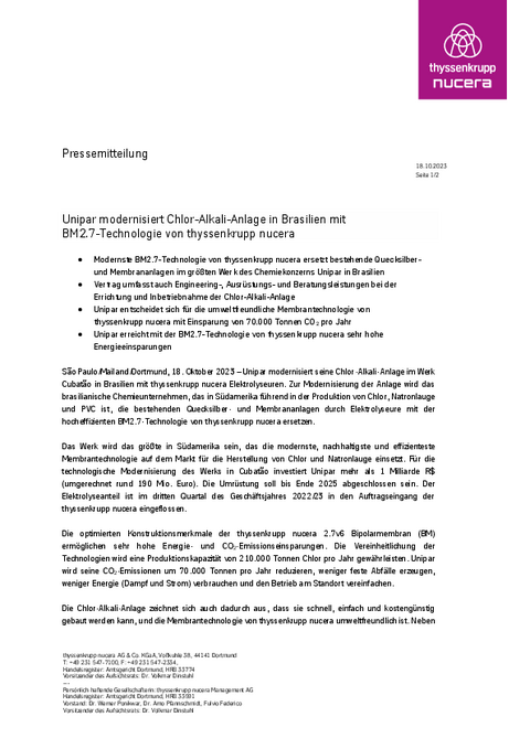 - Unipar entscheidet sich für die umweltfreundliche Membrantechnologie von thyssenkrupp nucera mit Einsparung von 70.000 Tonnen CO2 pro Jahr