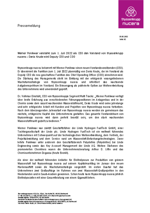 thyssenkrupp nucera bekommt mit Werner Ponikwar einen neuen Vorstandsvorsitzenden (CEO). Er übernimmt die Funktion zum 1. Juli 2022 planmäßig von Denis Krude, der im Vorstand als Deputy CEO die neu geschaffene Funktion des Chief Operating Officer (COO) einnehmen wird. Die Stärkung des Managements steht im Einklang mit der erfolgreich vorangetriebenen Wachstumsstrategie von thyssenkrupp nucera und reflektiert das wachsende Aufgabenspektrum im Vorstand. Ein Börsengang als präferierte Option zur Weiterentwicklung des Unternehmens wird unverändert geprüft.