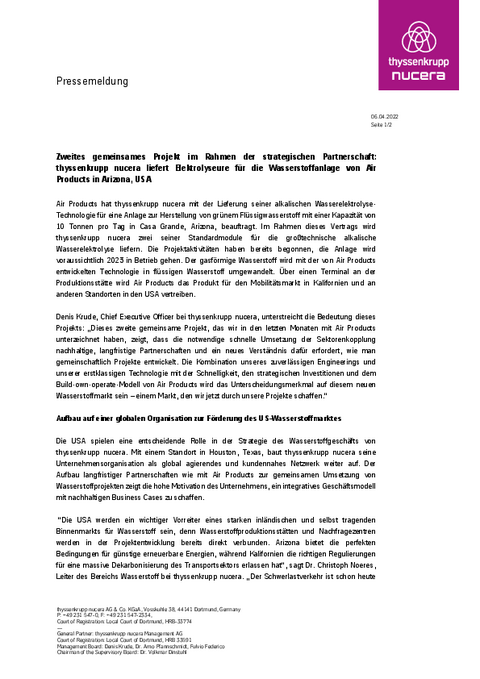 Zweites gemeinsames Projekt im Rahmen der strategischen Partnerschaft: thyssenkrupp nucera liefert Elektrolyseure für die Wasserstoffanlage von Air Products in Arizona, USA