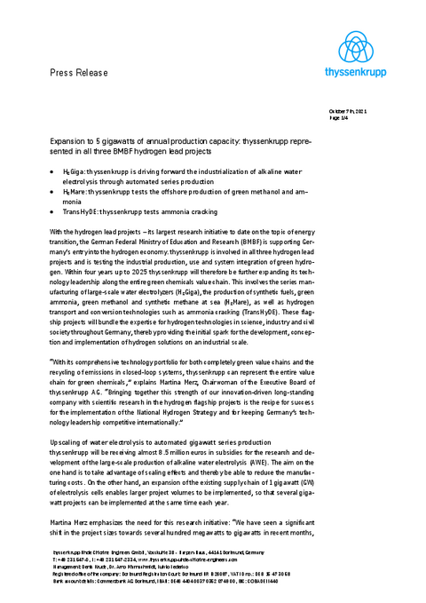 Expansion to 5 gigawatts of annual production capacity: thyssenkrupp represented in all three BMBF hydrogen lead projects