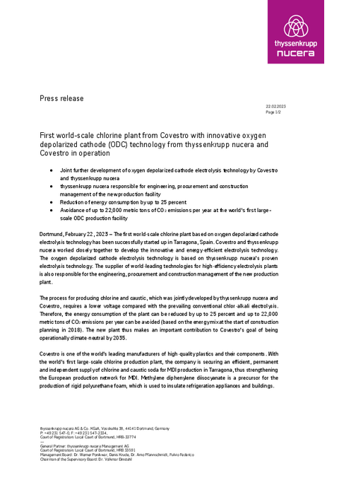 - Joint further development of oxygen depolarized cathode electrolysis technology by Covestro and thyssenkrupp nucera