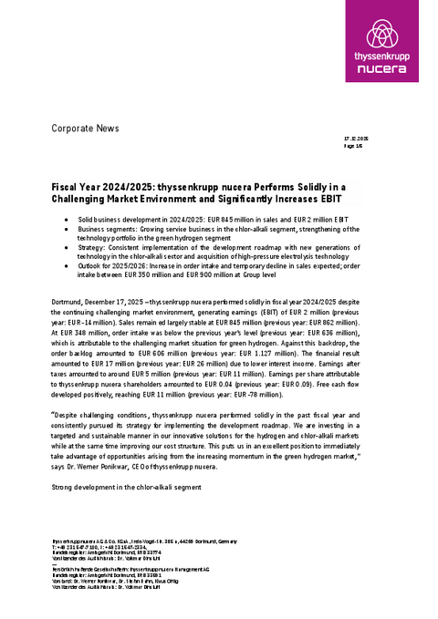Dortmund, December 17, 2025 – thyssenkrupp nucera performed solidly in fiscal year 2024/2025 despite the continuing challenging market environment, generating earnings (EBIT) of EUR 2 million (previous year: EUR -14 million). Sales remain ed largely stable at EUR 845 million (previous year: EUR 862 million). At EUR 348 million, order intake was below the previous year’s level (previous year: EUR 636 million), which is attributable to the challenging market situation for green hydrogen. Against this backdrop, the order backlog amounted to EUR 606 million (previous year: EUR 1.127 million). The financial result amounted to EUR 17 million (previous year: EUR 26 million) due to lower interest income. Earnings after taxes amounted to around EUR 5 million (previous year: EUR 11 million). Earnings per share attributable to thyssenkrupp nucera shareholders amounted to EUR 0.04 (previous year: EUR 0.09). Free cash flow developed positively, reaching EUR 11 million (previous year: EUR -78 million).