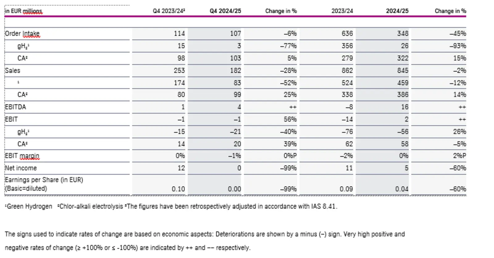 In the green hydrogen segment, sales are expected to be between EUR 150 million and EUR 220 million (2024/2025: EUR 459 million). The expected sales development is largely in line with the existing order backlog. Additional orders in the gH2 segment are not expected to have a significant impact on sales until the following years. In addition, EBIT of between EUR -80 million and EUR -55 million (2024/2025: EUR -56 million) is expected. An improved gross margin due to a more favorable project mix, cost savings, and a change in resource allocation between the segments should partially offset the lower sales.