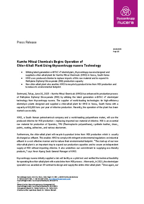 Dortmund, Tokyo, June 16, 2025 – Kumho Mitsui Chemicals (KMCI) has enhanced its production process of Methylene Diphenyl Diisocyanate (MDI) by utilizing the latest generation e-BiTAC v7 electrolyzer technology from thyssenkrupp nucera. The supplier of world-leading technologies for high-efficiency electrolysis plants designed and supplied a chlor-alkali plant for KMCI in Yeosu, South Korea with a capacity of 60,000 tons per year of chlorine production. Recently, the operation of the plant has been started successfully.
