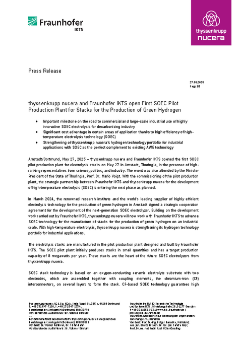 Arnstadt/Dortmund, May 27, 2025 – thyssenkrupp nucera and Fraunhofer IKTS opened the first SOEC pilot production plant for electrolysis stacks on May 27 in Arnstadt, Thuringia, in the presence of high-ranking representatives from science, politics, and industry. The event was also attended by the Minister President of the State of Thuringia, Prof. Dr. Mario Voigt. With the commissioning of the pilot production plant, the strategic partnership between Fraunhofer IKTS and thyssenkrupp nucera for the development of high-temperature electrolysis (SOEC) is entering the next phase as planned.