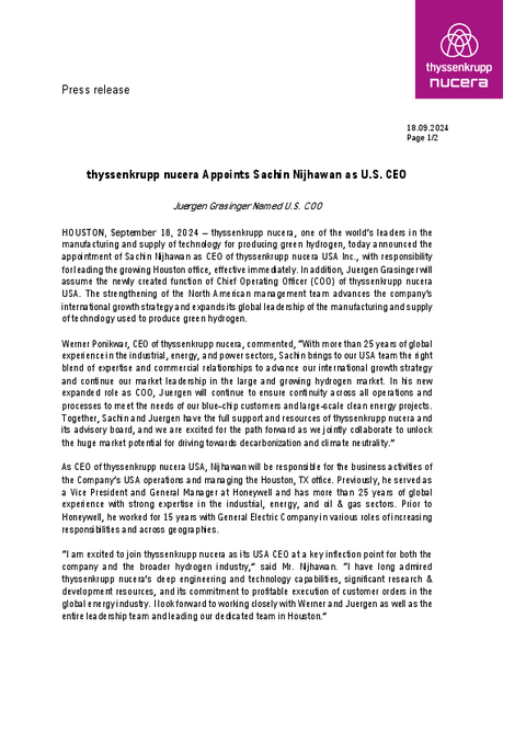 Houston, September 18, 2024 – thyssenkrupp nucera, one of the world’s leaders in the manufacturing and supply of technology for producing green hydrogen, today announced the appointment of Sachin Nijhawan as CEO of thyssenkrupp nucera USA Inc., with responsibility for leading the growing Houston office, effective immediately. In addition, Juergen Grasinger will assume the newly created function of Chief Operating Officer (COO) of thyssenkrupp nucera USA. The strengthening of the North American management team advances the company’s international growth strategy and expands its global leadership of the manufacturing and supply of technology used to produce green hydrogen.