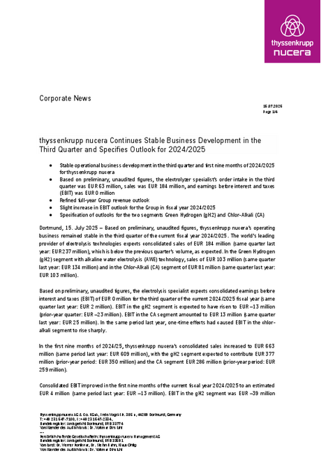 Dortmund, 15. July 2025 – Based on preliminary, unaudited figures, thyssenkrupp nucera’s operating business remained stable in the third quarter of the current fiscal year 2024/2025. The world’s leading provider of electrolysis technologies expects consolidated sales of EUR 184 million (same quarter last year: EUR 237 million), which is below the previous quarter’s volume, as expected. In the Green Hydrogen (gH2) segment with alkaline water electrolysis (AWE) technology, sales of EUR 103 million (same quarter last year: EUR 134 million) and in the Chlor-Alkali (CA) segment of EUR 81 million (same quarter last year: EUR 103 million).