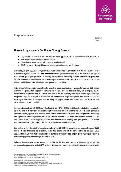 Dortmund, August 28, 2023 – thyssenkrupp nucera remained on growth track in the third quarter of the current fiscal year 2022/2023. Order intake in the third quarter increased by 13 percent year-on-year to €242 million (prior-year period: €215 million). Mainly due to increasing demand for the latest generation of environmentally friendly chlor-alkali electrolysis solutions from thyssenkrupp nucera, order intake almost doubled to €214 million (prior-year period: €112 million).