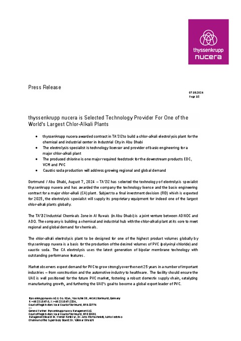 Dortmund / Abu Dhabi, August 7, 2024 – TA’ZIZ has selected the technology of electrolysis specialist thyssenkrupp nucera and has awarded the company the technology license and the basic engineering contract for a major chlor-alkali (CA) plant. Subject to a final investment decision (FID) which is expected for 2025, the electrolysis specialist will supply its proprietary equipment for indeed one of the largest chlor-alkali plants globally.