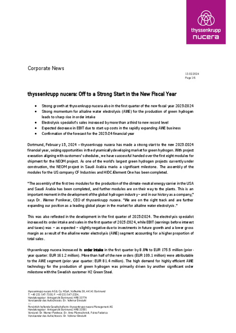 - Strong growth at thyssenkrupp nucera also in the first quarter of the new fiscal year 2023/2024