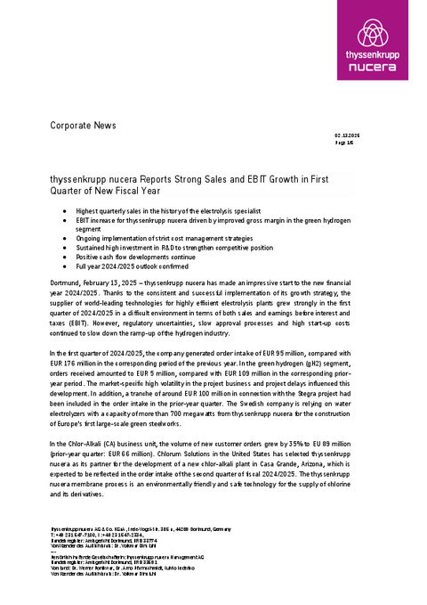 Dortmund, February 13, 2025 – thyssenkrupp nucera has made an impressive start to the new financial year 2024/2025. Thanks to the consistent and successful implementation of its growth strategy, the supplier of world-leading technologies for highly efficient electrolysis plants grew strongly in the first quarter of 2024/2025 in a difficult environment in terms of both sales and earnings before interest and taxes (EBIT). However, regulatory uncertainties, slow approval processes and high start-up costs continued to slow down the ramp-up of the hydrogen industry.