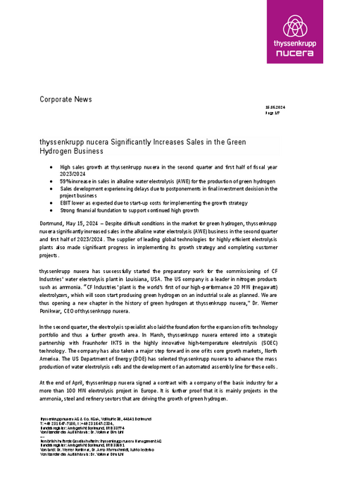 Dortmund, May 15, 2024 – Despite difficult conditions in the market for green hydrogen, thyssenkrupp nucera significantly increased sales in the alkaline water electrolysis (AWE) business in the second quarter and first half of 2023/2024. The supplier of leading global technologies for highly efficient electrolysis plants also made significant progress in implementing its growth strategy and completing customer projects.