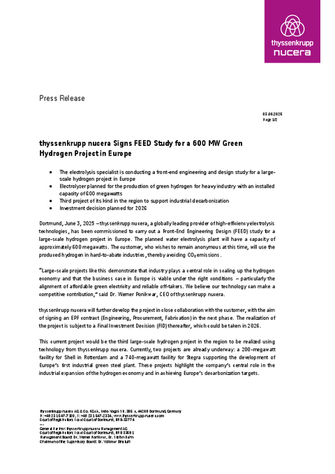 thyssenkrupp nucera will further develop the project in close collaboration with the customer, with the aim of signing an EPF contract (Engineering, Procurement, Fabrication) in the next phase. The realization of the project is subject to a Final Investment Decision (FID) thereafter, which could be taken in 2026.