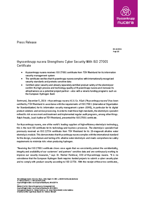 Dortmund, December 5, 2024 – thyssenkrupp nucera AG & Co. KGaA (“thyssenkrupp nucera”) has been certified by TÜV Rheinland in accordance with the requirements of ISO 27001 (International Organization for Standardization) for its information security management system (ISMS), in particular for its digital product solutions and service processing. In order to meet these high standards, the electrolysis specialist refined its risk assessment and treatment and implemented regular audit programs, among other things. Ralph Freude, Lead Auditor at TÜV Rheinland, presented the ISO 27001 certificate.