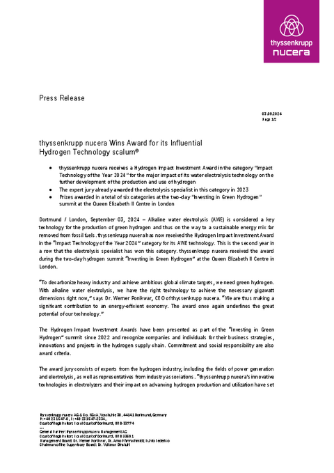 - thyssenkrupp nucera receives a Hydrogen Impact Investment Award in the category “Impact Technology of the Year 2024” for the major impact of its water electrolysis technology on the further development of the production and use of hydrogen