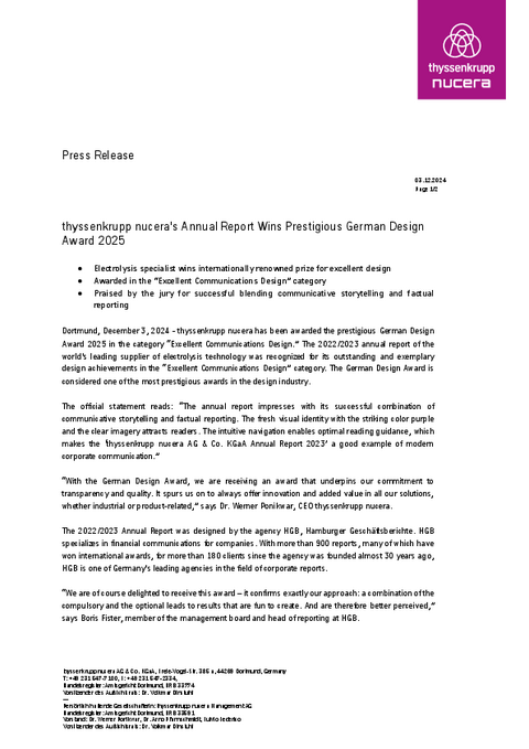 thyssenkrupp nucera's Annual Report Wins Prestigious German Design Award 2025