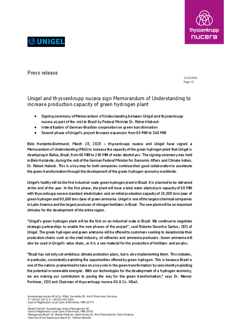Belo Horizonte/Dortmund, March 13, 2023 – thyssenkrupp nucera and Unigel have signed a Memorandum of Understanding (MoU) to increase the capacity of the green hydrogen plant that Unigel is developing in Bahia, Brazil, from 60 MW to 240 MW of water electrolysis. The signing ceremony was held in Belo Horizonte, during the visit of the German Federal Minister for Economic Affairs and Climate Action, Dr. Robert Habeck. This is a key step for both companies continue their good collaboration to accelerate the green transformation through the development of the green hydrogen economy worldwide.