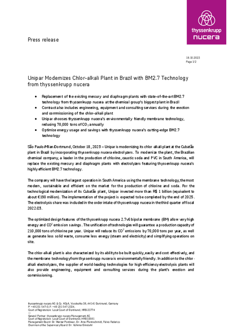 - Unipar chooses thyssenkrupp nucera’s environmentally friendly membrane technology, reducing 70,000 tons of CO2 annually